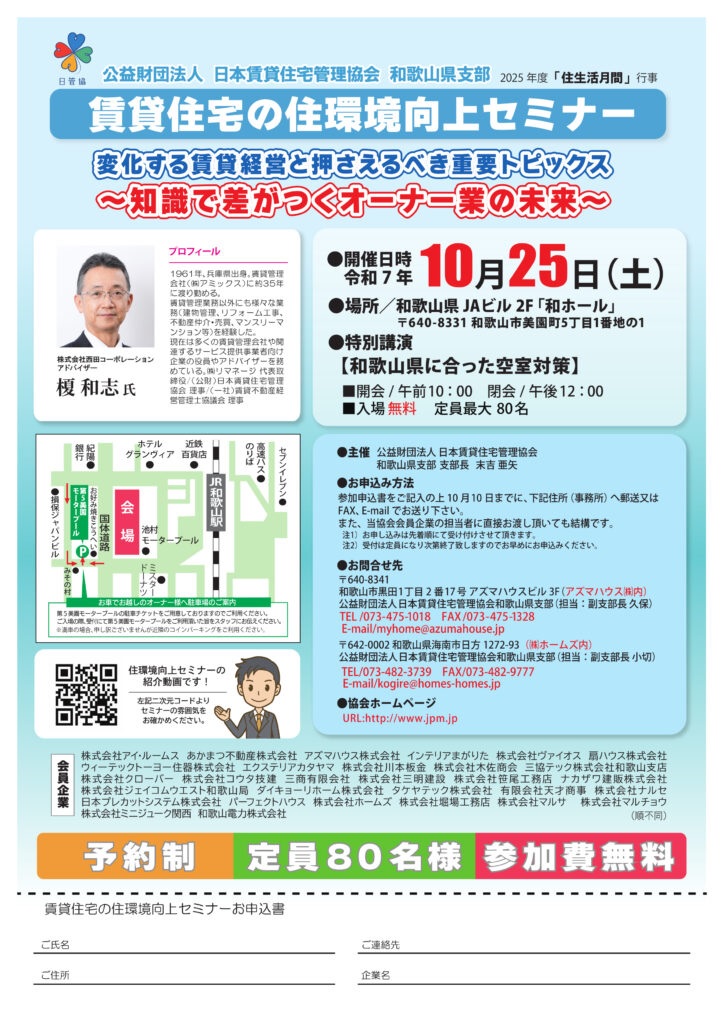 当社社長が支部長を務めます「公益財団法人日本賃貸住宅管理協会和歌山県支部」が、国土交通省が実施する「住生活月間」の協賛行事として毎年開催しております「賃貸住宅の住環境向上セミナー」を開催する運びとなりました。